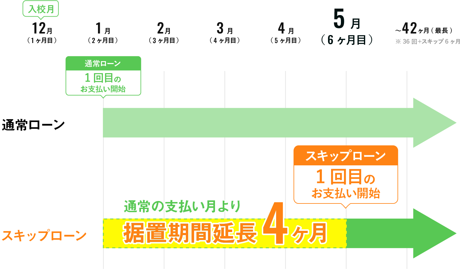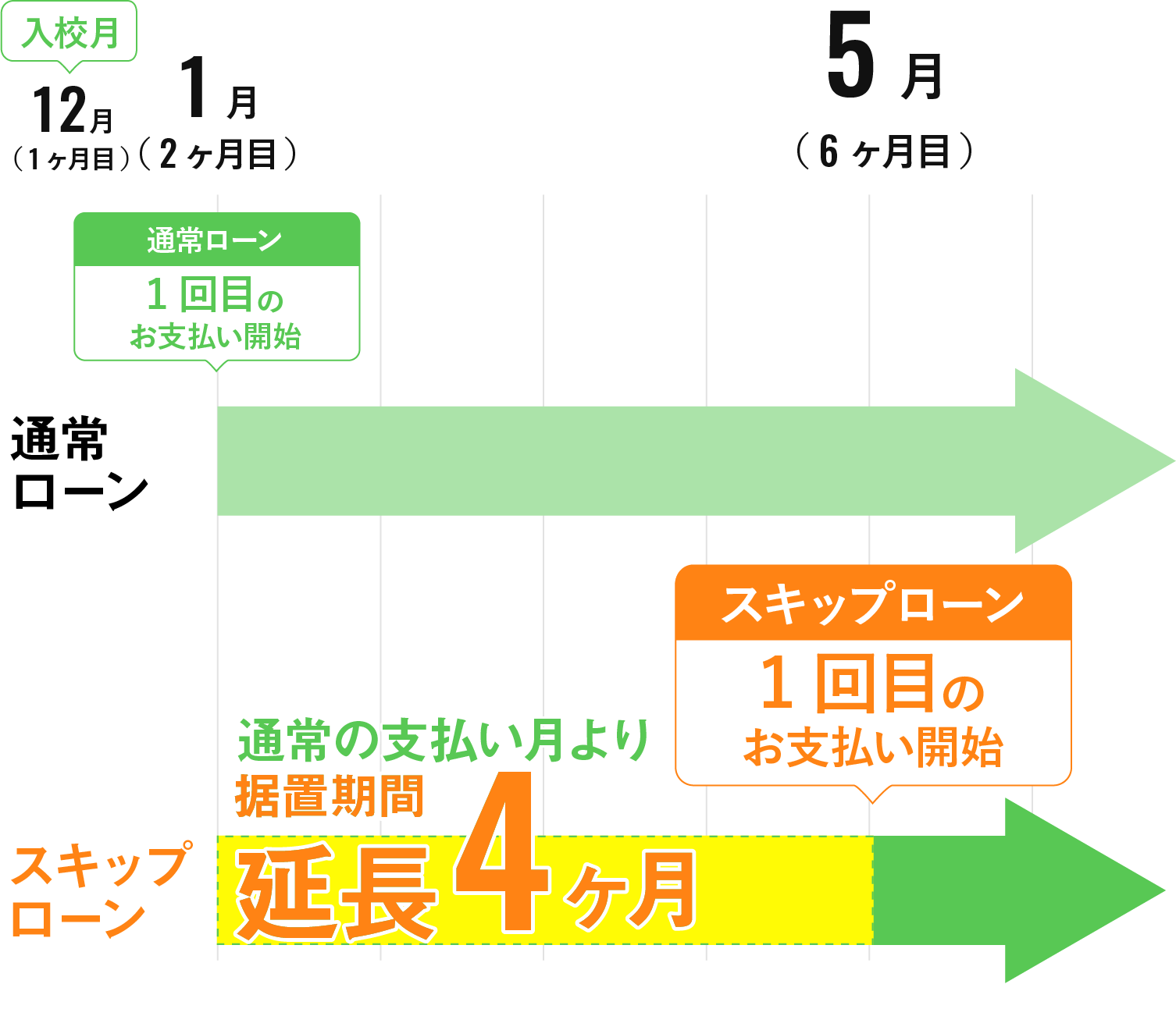 「オリコ」・「エポスカード」2社のローンをご用意しております。学生スキップローンはお支払い開始が入校日から最長6ヶ月後よりスタート!